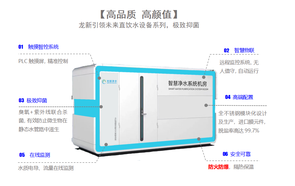 RO系列高端直飲水設備,采用了反滲透技術制備生活飲用水和純凈水。出水即純凈水,能濾除水中的細菌、病毒、重金毒、重金屬等有害物質,同時保留礦物質。原水水質:市政自來水、水質指標符合GB/5749生活飲用水衛生標準;產水電導率<15us/cm,水質符合《飲用凈水水質標準》CJ94-2005用水指標細菌總數≤50cfu/mL;《生活飲用水水質處理器衛生安全與功能評價規范-反滲透處理裝置》(2001)的要求。衛生許可批準文號:(湘)衛水字(2022)第0052號.