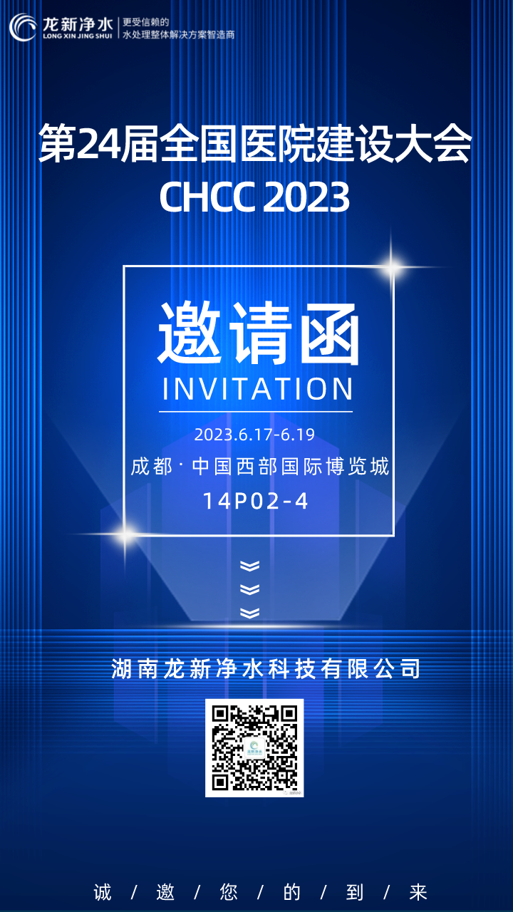 我們非常榮幸的邀請您參加于2023年6月17-19日在中國成都·中國西部國際博覽城舉辦的“第24屆全國醫院建設大會”,龍新凈水將攜醫用純水系統與您會面,期待您的到來!