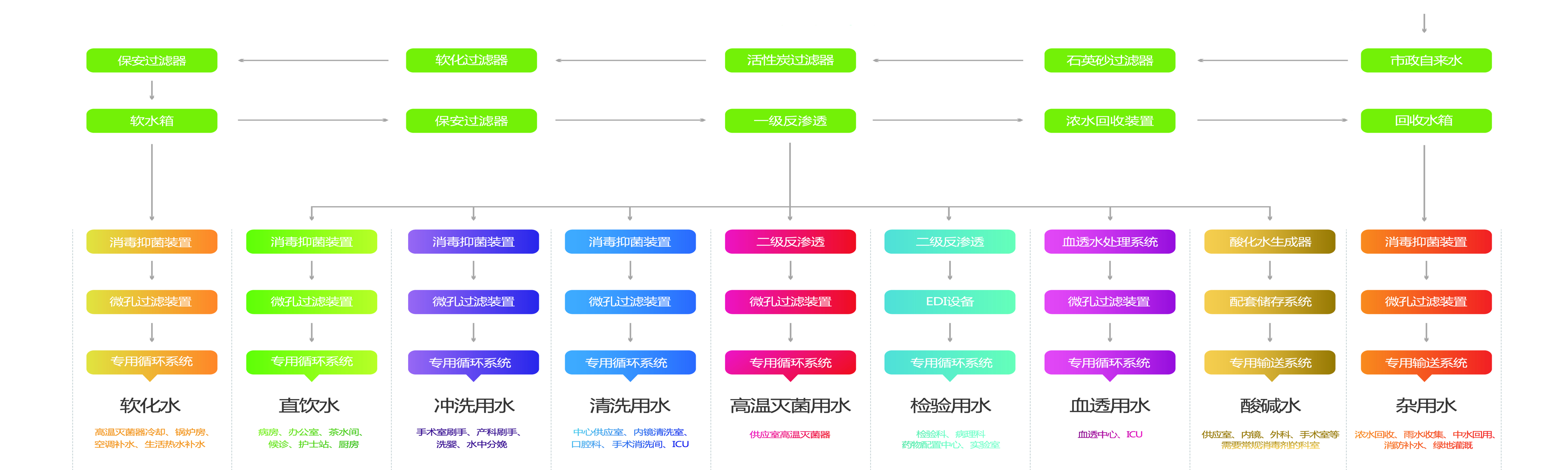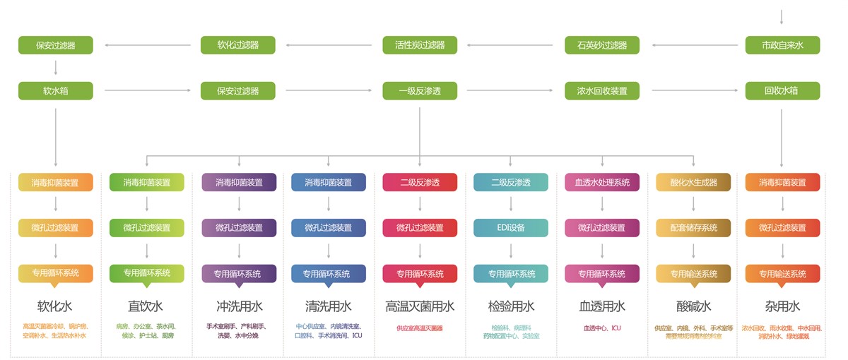 醫院集中分質供水系統是用一套水處理系統對自來水進行深度處理,使其達到各科室可直接使用的水質標準,再分別由專用管網供給各科室使用的供水系統。